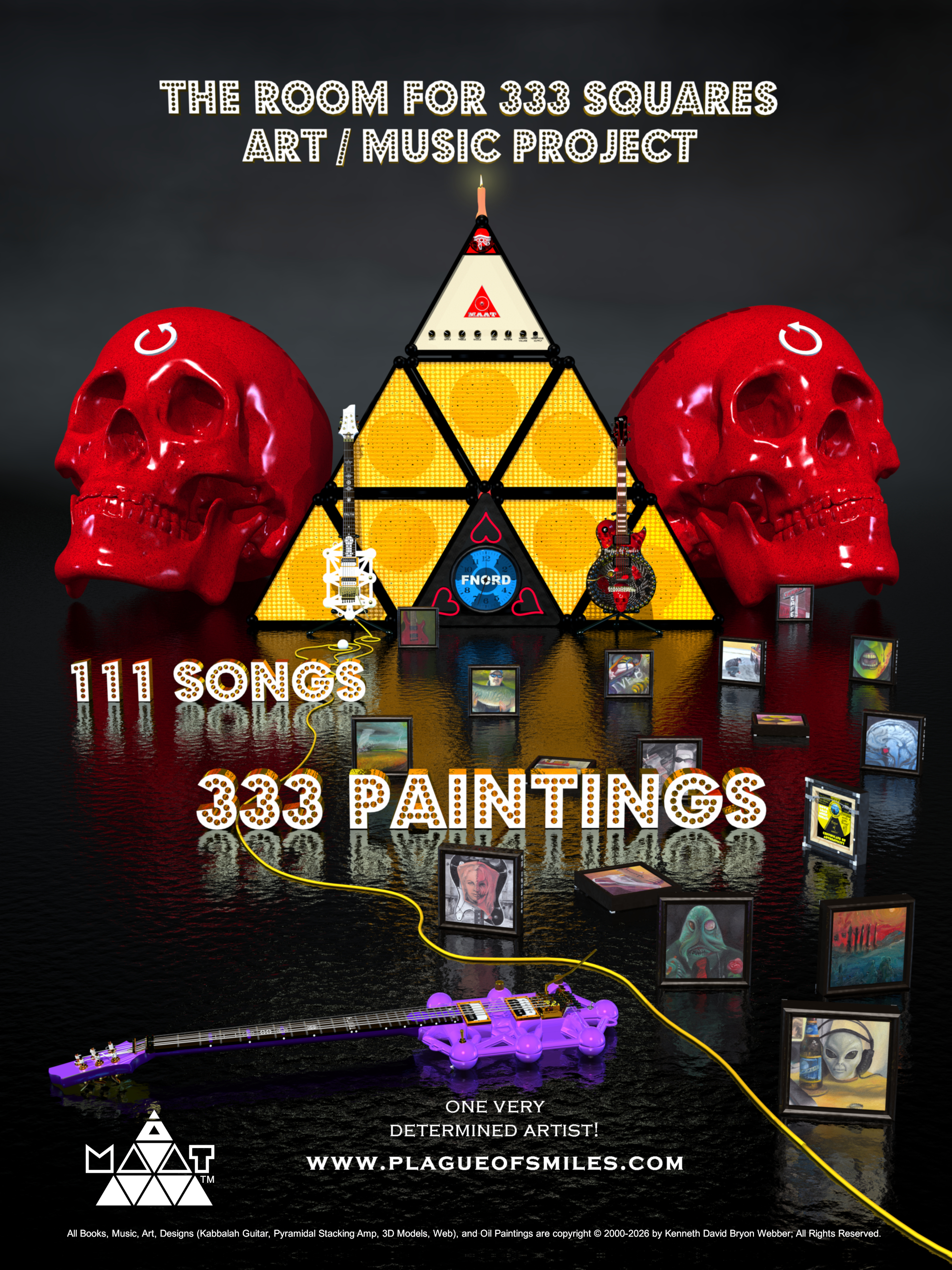 "DARK BREED INVENT NEW HOBBY" copyright © 2020 by Kenneth David Bryon Webber (anagram) is the title of the piece shown above. This work of fine art is a photograph taken within my 3D AR/VR/MR world (The Room for 333 Squares Art/Music Project), and features my very own Kabbalah Tree of Life inspired guitar design TRUTH™ (white guitar) and my pyramidal stacking amp system MAAT™. Both the pyramid amp system and the Kabbalah Tree of Life guitar design are designs I created when I was homeless and living on the streets of San Diego in 2000. I've come a long way since those dark days!----- Hello, my name is Ken D. Webber. I am the primary creative force behind Plague of Smiles™ LLC. For the moment, this website is used as a placeholder and to conduct business with partners and select clients out of the public eye. Plague is working at the speed of a running snail producing art, music, and attempting to absorb all relevant knowledge on copyrights, licensing, and branding. Besides the art and music we are excited about our TRUTH™ Line of Signature Guitars (all inspired by the Kabbalah Tree of Life / Tree of Death symbol; which is itself found within the Flower of Life symbol and encourages a study of sacred geometry and the Platonic solids - among other things) and MAAT™ - our pyramidal amp stacking system. We are working on a long, slow, five year plan that involves creating 77 NFT's, 111 songs, and 333 works of art. The goal is partially hampered by a medical condition I acquired while on active duty in the US Marine Corps. Click the banner above and it will take you to my online diary www.kendwebber.com and there you will find my bio at the bottom of that page. There's your clue. And for the next couple of years... that is it! Keep us in the back of your mind and thoughts and we will return when our plans are finalized and ready for presentation. Much love and beauty! Kenneth David Bryon Webber click the image above to see the spec sheet
